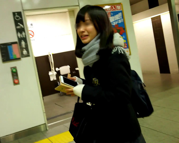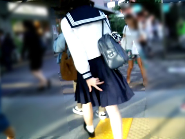 静止画の後、セーラー服を着ている彼女を後ろからついていくシーン。全身をくまなく映していきます。