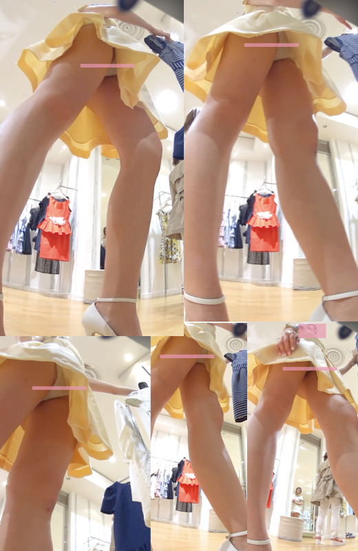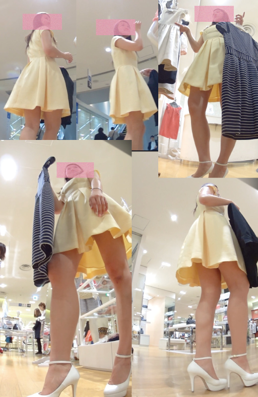 今回のターゲットちゃんは、なんとそのような黄色のミニワンピースを着たオシャレな店員さんで、広がってるスソの下にカメラをイン!