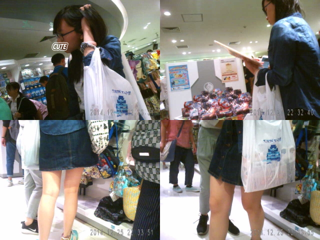 デニムの膝上くらいのタイトスカートを履いた女の子の逆さ撮り動画です。